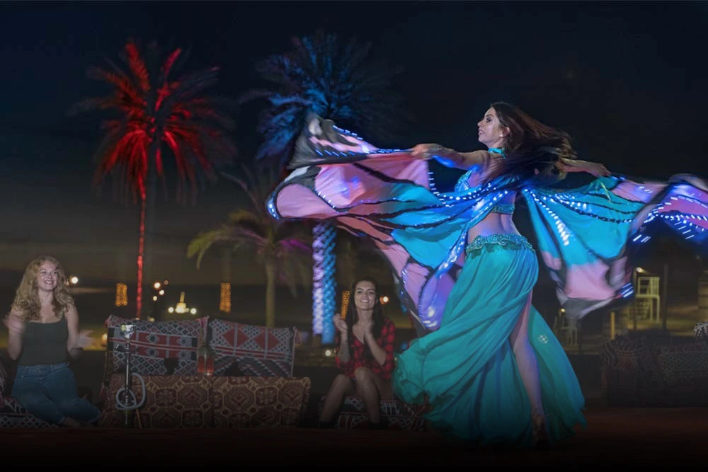 بعد الإثارة، تسترخي بركوب الجمال والتزلج على الرمال، ثم تستمتع بمنظر الغروب في محطة تصوير بانورامية. تصل بعد ذلك إلى المخيم البدوي حيث يُقدَّم لك عشاء فاخر مع عروض فنية تقليدية في أجواء عربية أصيلة.