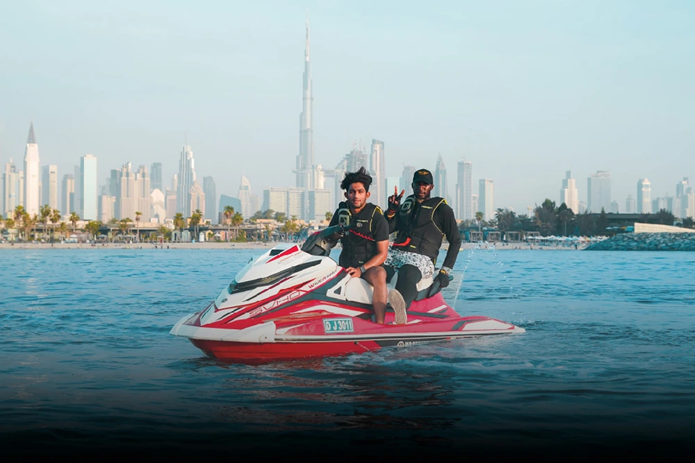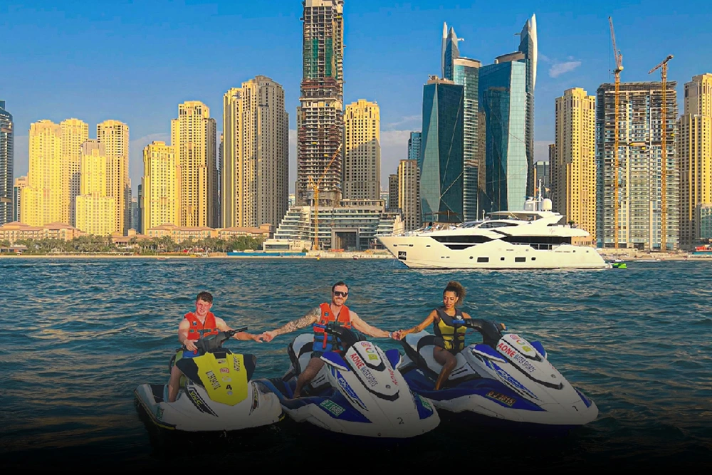 قد بنفسك جت سكي قوي على مياه الخليج، مع إطلالات مباشرة على أبراج مرسى دبي، شاطئ JBR وجزيرة بلو ووترز وعين دبي، والتقط صوراً لا تُنسى مع أفق دبي خلفك.