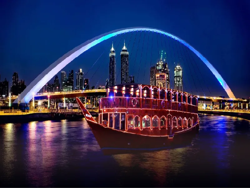 Experimenta el encanto de las vías fluviales de Dubái con el Crucero de Cena en Dhow por el Canal de Desert Fun Tourism. Sube a bordo de nuestro tradicional barco dhow y navega por el pintoresco Canal de Dubái, bordeado de impresionantes vistas al agua y arquitectura moderna. Deléitate con una deliciosa cena buffet que ofrece una variedad de cocinas internacionales, preparadas por nuestros expertos chefs. Contempla los emblemáticos lugares de interés como el Burj Khalifa y el Puente del Canal de Dubái iluminados contra el cielo nocturno. Sumérgete en el ambiente de entretenimiento en vivo mientras navegas por el corazón de la ciudad. Con Desert Fun Tourism, disfruta de una encantadora noche de cena, relajación y vistas fascinantes en nuestro Crucero de Cena en Dhow por el Canal.