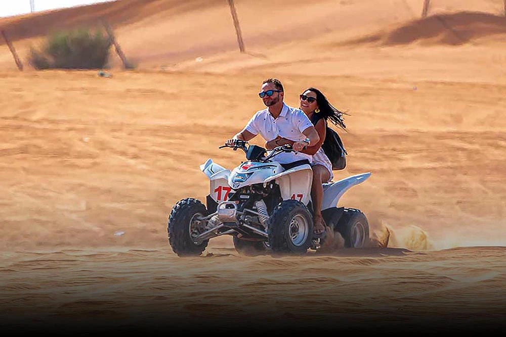Покорите золотые дюны Дубая на мощном квадроцикле 700cc, а затем расслабьтесь в традиционном бедуинском лагере с ужином BBQ и вечерними шоу. Это идеальное сочетание адреналина и культурного отдыха. Забронируйте с Desert Fun и получите незабываемый вечер в пустыне!