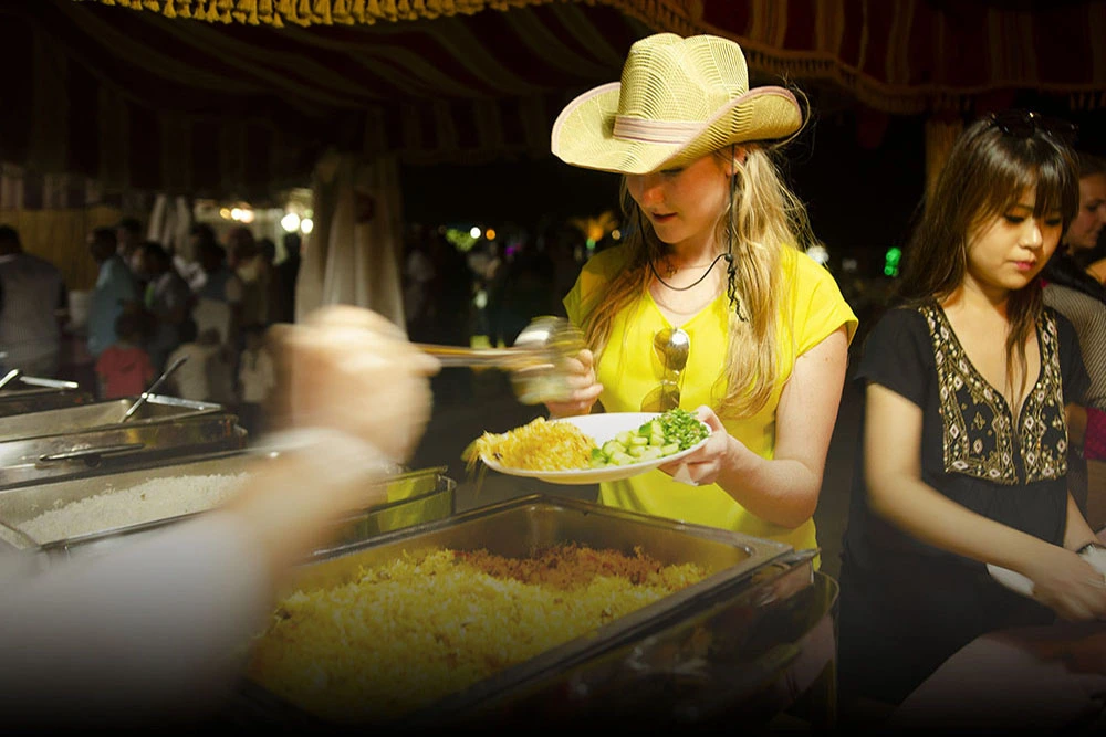 Открытый буфет, блюда на гриле, свежие салаты, восточные закуски, сладости и напитки. На сцене — танец живота, огненное шоу и танура.