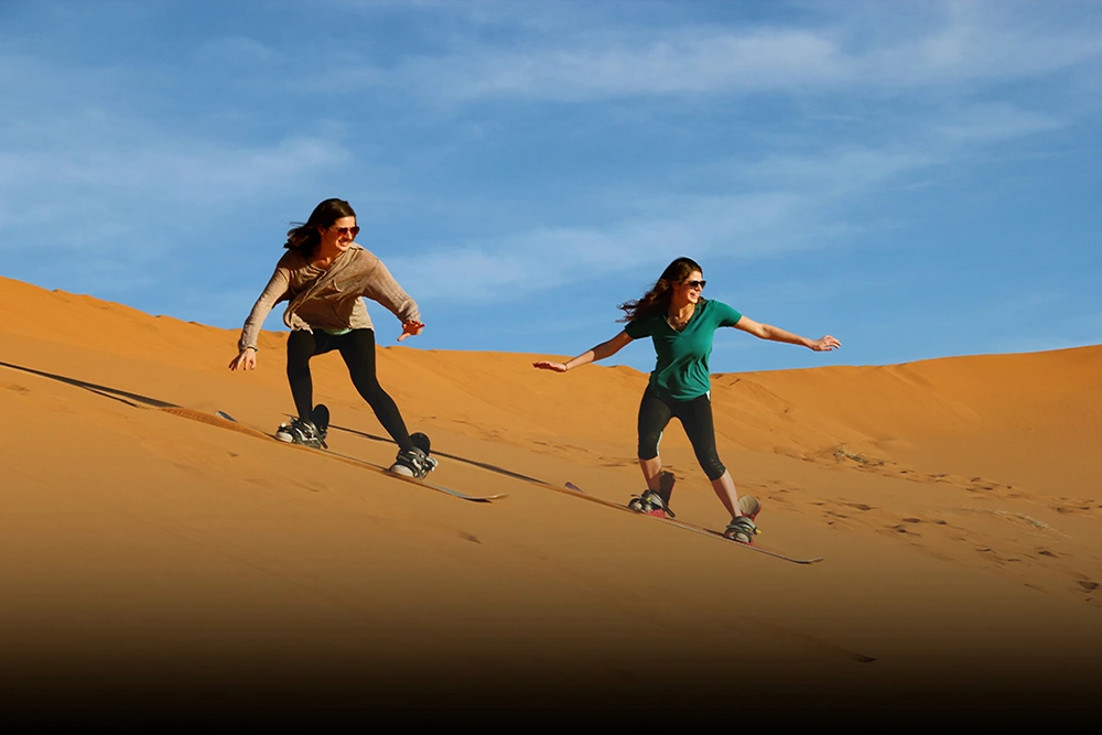 As the afternoon cools and the sun starts to sink, you’ll leave the city behind and drive toward the Lahbab Red Dunes. The desert slowly opens up into endless sand hills, golden light and quiet horizons.