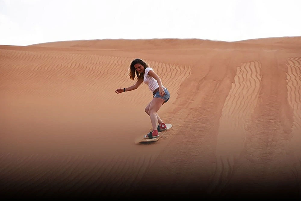 Enjoy a short camel ride and try your hand at sandboarding before heading to the desert camp.